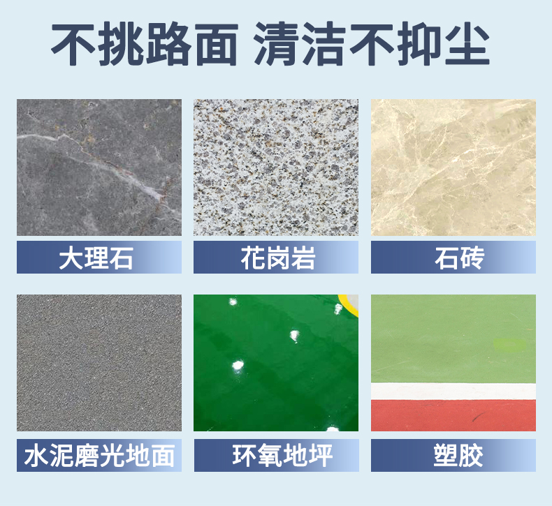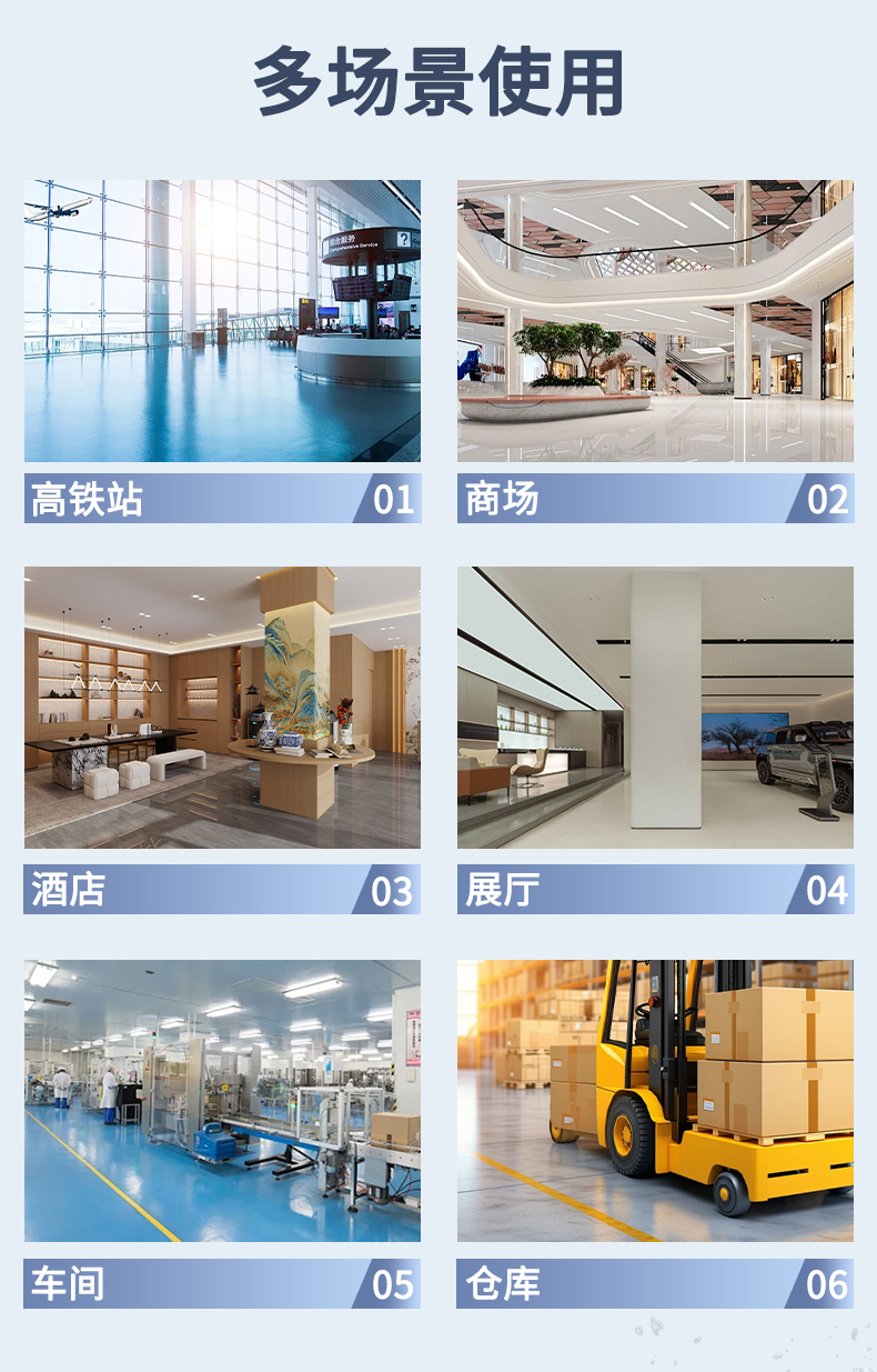 適用場所:車間、物流中心、超市、酒店、高鐵站、展館等大型場所的硬地面保潔與保養。如:環氧樹脂地面、大理石地面、拋光磚地面、水磨石地面等。