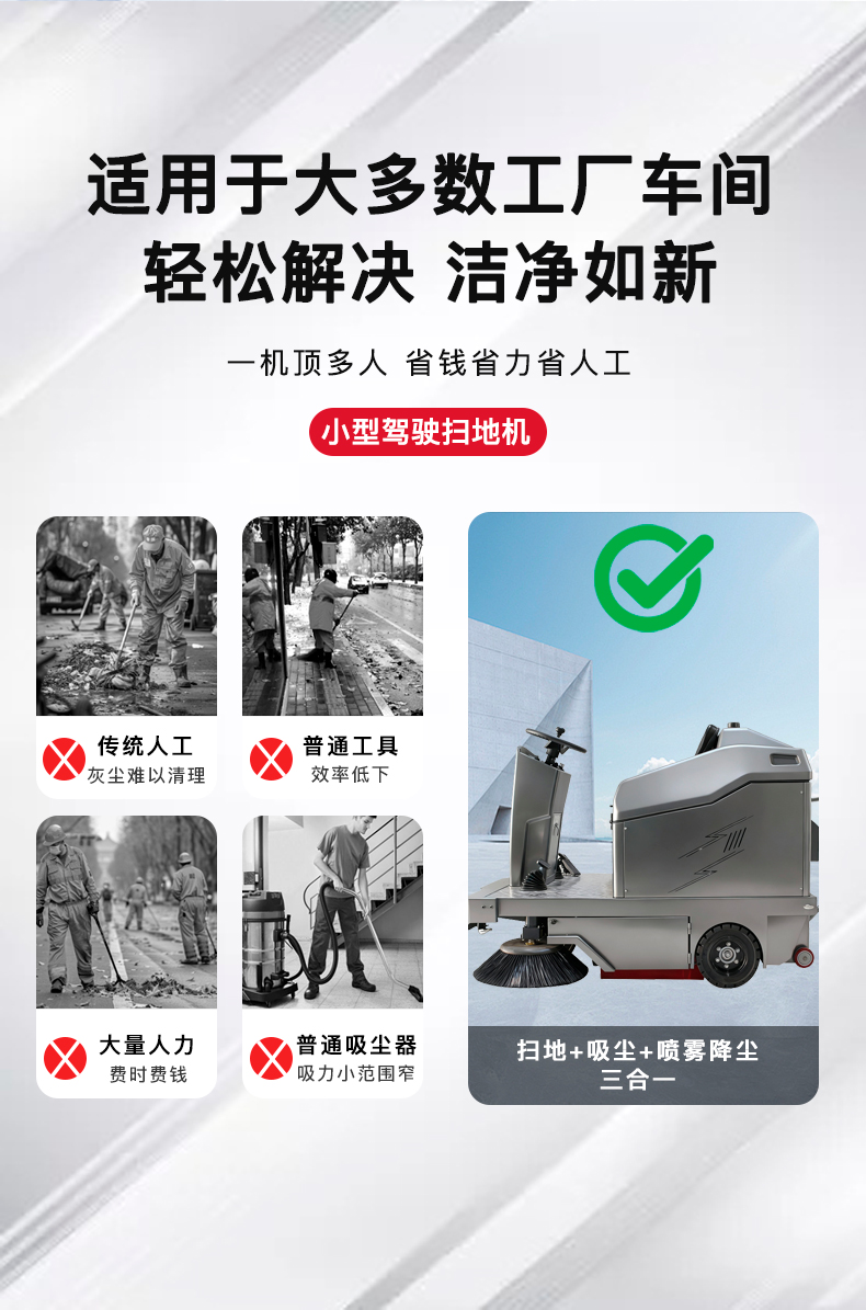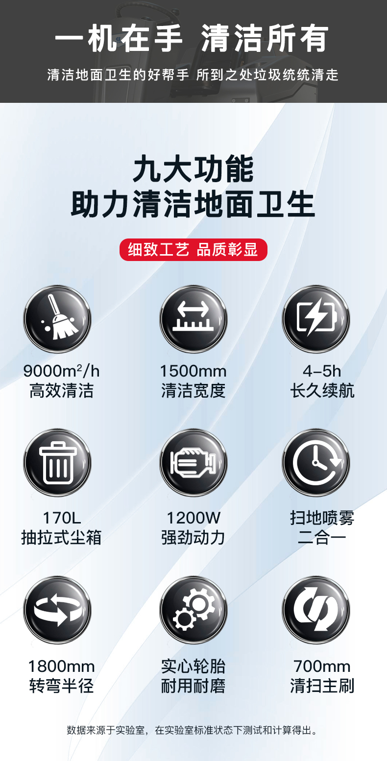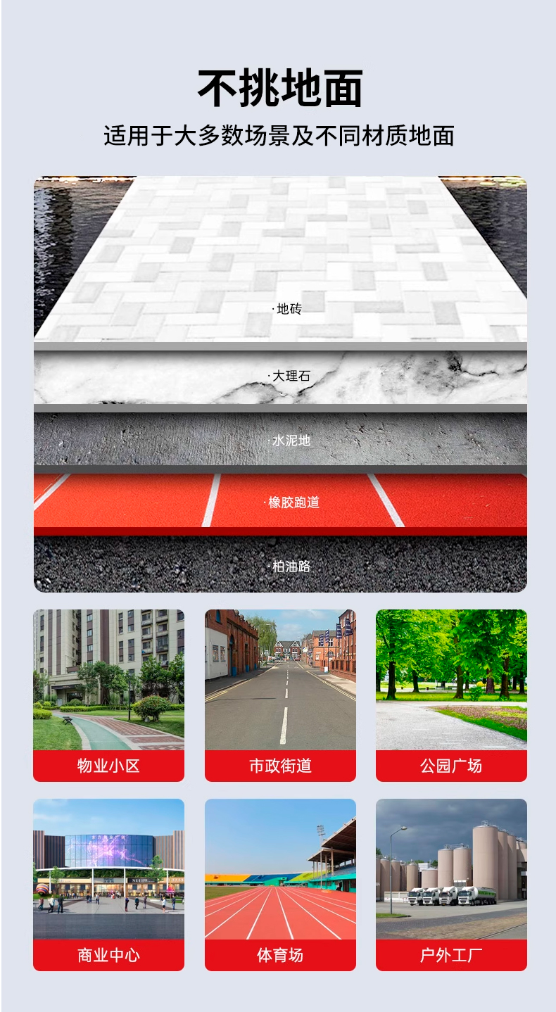 適用場所:適用于柏油路、水泥路、大理石、方磚、地磚等硬質地面,能高效的完成物業保潔、工廠車間、市政道路、醫院社區、校園景區、廣場公園、粉塵車間等公共場所地面的日常清潔工作