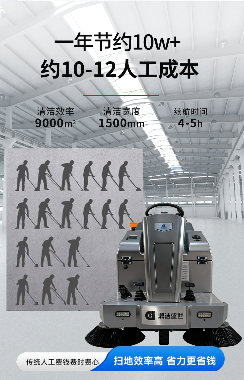 駕駛式洗地機怎么選擇?1 清潔效率:優先選擇每小時清潔面積&ge;2000㎡、續航&ge;4小時的機型,如鼎潔盛世DJ530M(2700㎡ h,續航5小時)。