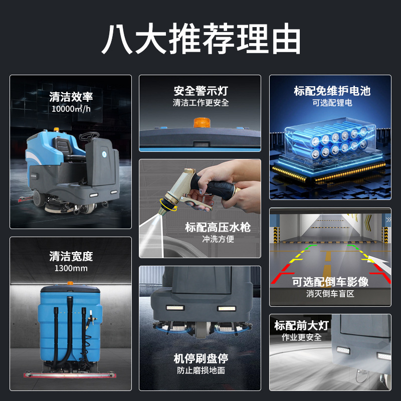 駕駛式洗地機怎么選擇?1 清潔效率:優先選擇每小時清潔面積&ge;2000㎡、續航&ge;4小時的機型,如鼎潔盛世DJ530M(2700㎡ h,續航5小時)。